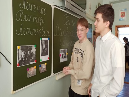 В декабре 2023 года проведены музейные уроки «Герои спецоперации» в начальном, основном и среднем звене школы. Обучающиеся узнали о земляках, погибших в ходе СВО, честно и достойно исполнивших свой воинский долг. Это Шевелёв А.Н., Курьянов В.К., Лебедев А.Н., Легенький И.А., Васильев Н.М., Трошкин Н.Н. Они посмертно получили орден Мужества. Указом Президента Российской Федерации от 17 апреля 2023 года за мужество и героизм, проявленные при исполнении воинского долга, гвардии майору Васильеву Николаю Михайловичу присвоено звание Героя Российской Федерации (посмертно). Дети с интересом слушали рассказ, отвечали на вопросы «Кто такой герой?», «Какими качествами он обладает?».
